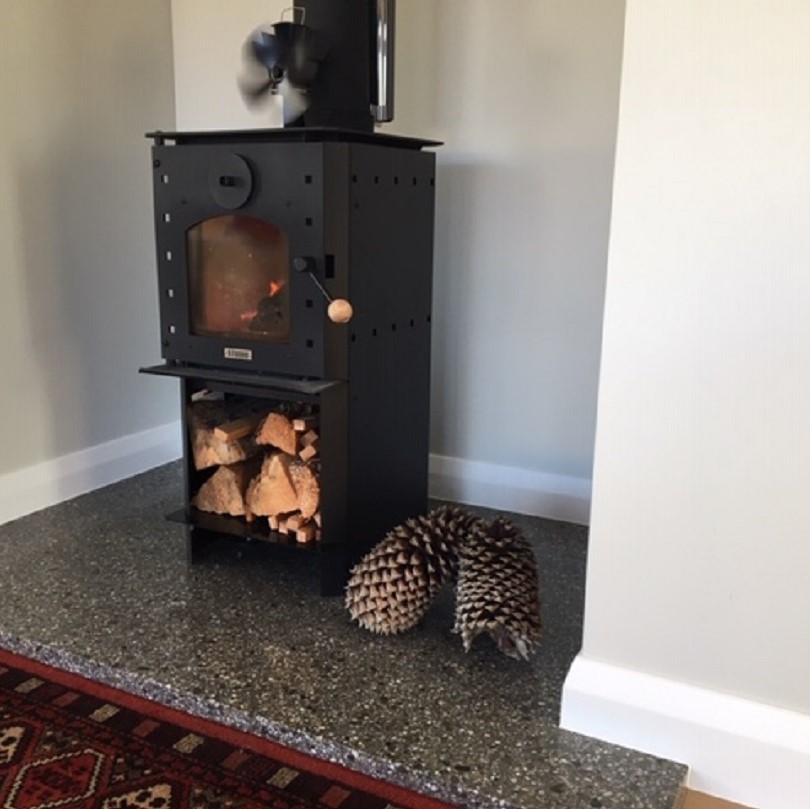 Polished Concrete Fire Hearth – charcoal concrete with mixed pebbles
